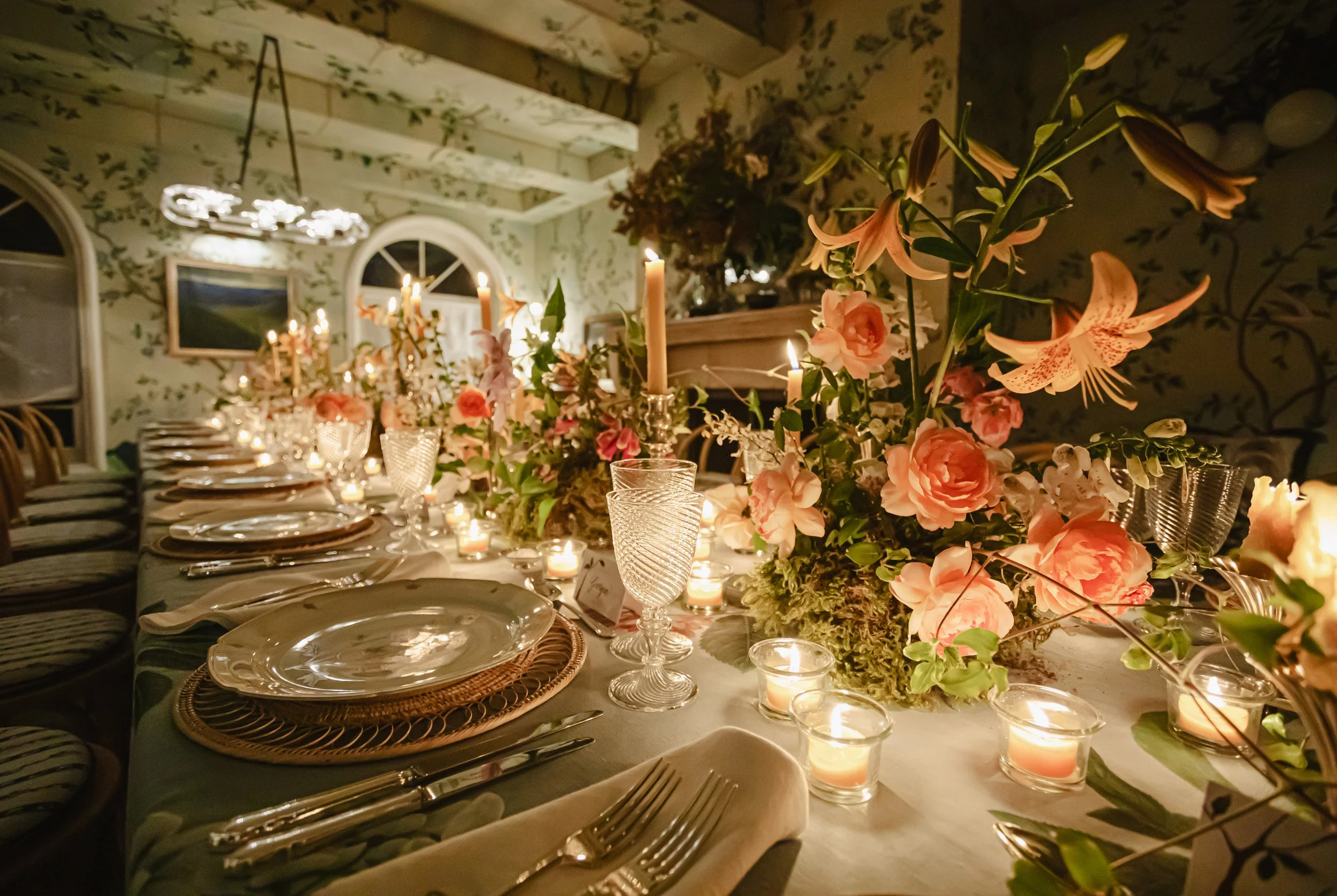 “Over eleven distinct rooms, the story of de Gournay’s unique artistic vision and technical mastery comes to life in eye-catching detail. Within the elegant living room, the hand-painted ‘Nordic Garden’ wallpaper, designed in collaboration with designer Michael S. Smith, welcomes the outdoors in via a rustic chinoiserie with a markedly Scandinavian character. The wallpaper is complemented by a new ceiling design, ‘Arbour’, that further extends the delicately trailing vines and leafy foliage upon an overhanging trellis” [de Gournay].